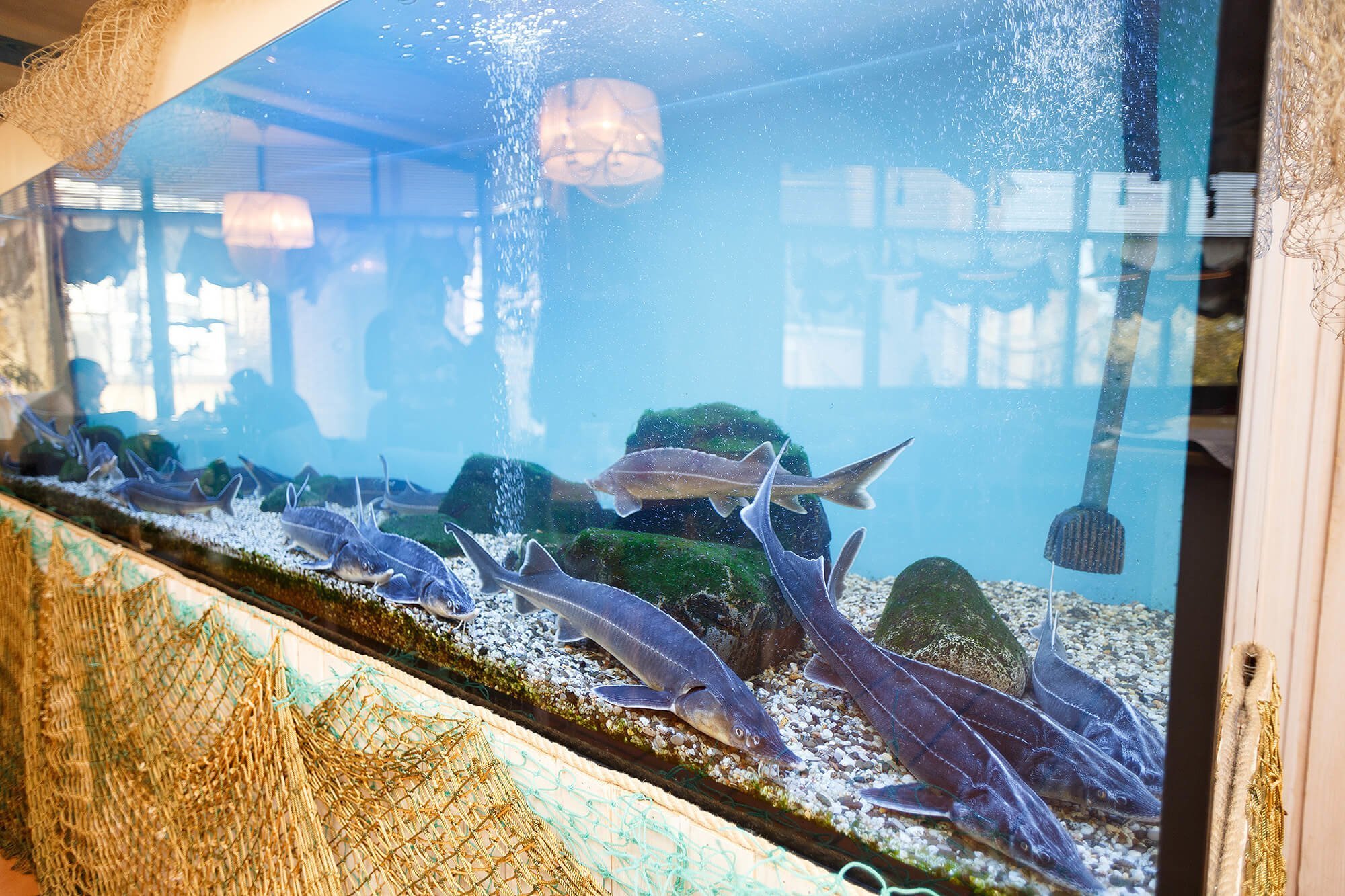 There are several halls in the “Barkas”. At the entrance is a bar counter and a lounge-area with comfortable sofas. Further is “Sea Hall” with velor armchairs and chandeliers in the fishing nets. On the second floor is a single zoned space with a huge aquarium. A small VIPhall for 15 persons is like a passengers’ lounge. Every Saturday the restaurant hosts the cooking masterclasses.