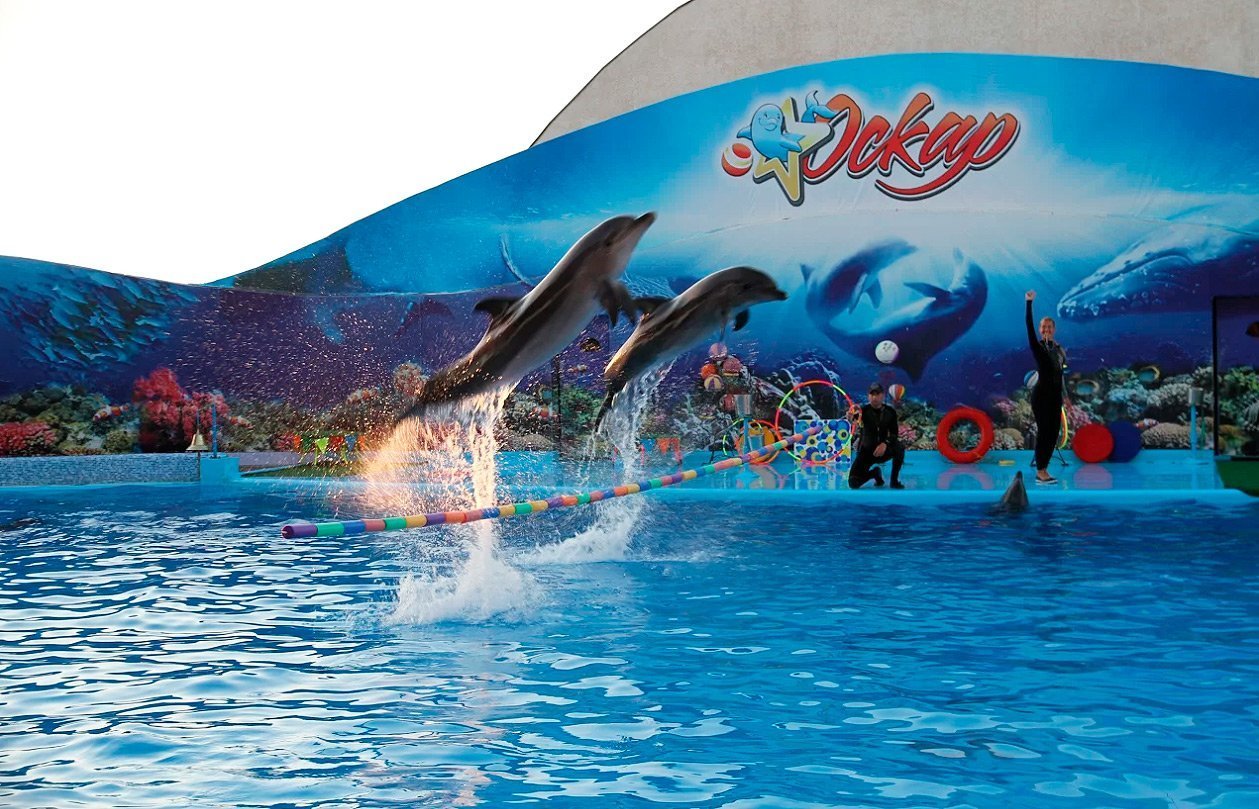 The Dolphinarium «Oscar» is built according to the newest project, so animals live comfortably there. The audience stands are located such a way that guests are placed in the shade all day long. The artists of the Dolphinarium are five Black Sea dolphins and three seagulls. Animals moved to Kyrylivka in 2011 from Yalta. One of the dolphins during a performance shows a unique number - for a long time holds his coach. No one will be indifferent while watching the original tricks performed by dolphin artists, so each spectator will receive a lot of positive emotions and pleasure. After a dolphin show, adults and children can swim with them, take photos, buy souvenirs, and win tickets to the water park.