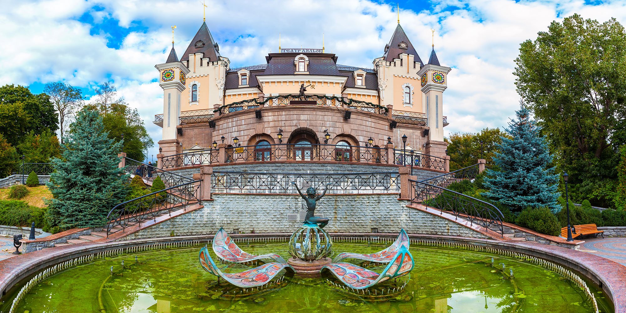 The theater building has the image of a fairy palace both externally and in the interior, in addition to the territory adjoining to the building, it is also decorated as a real children's fairy-tale town (sculptures of fairy tales, fountains, benches for rest, flowerbeds, etc.).