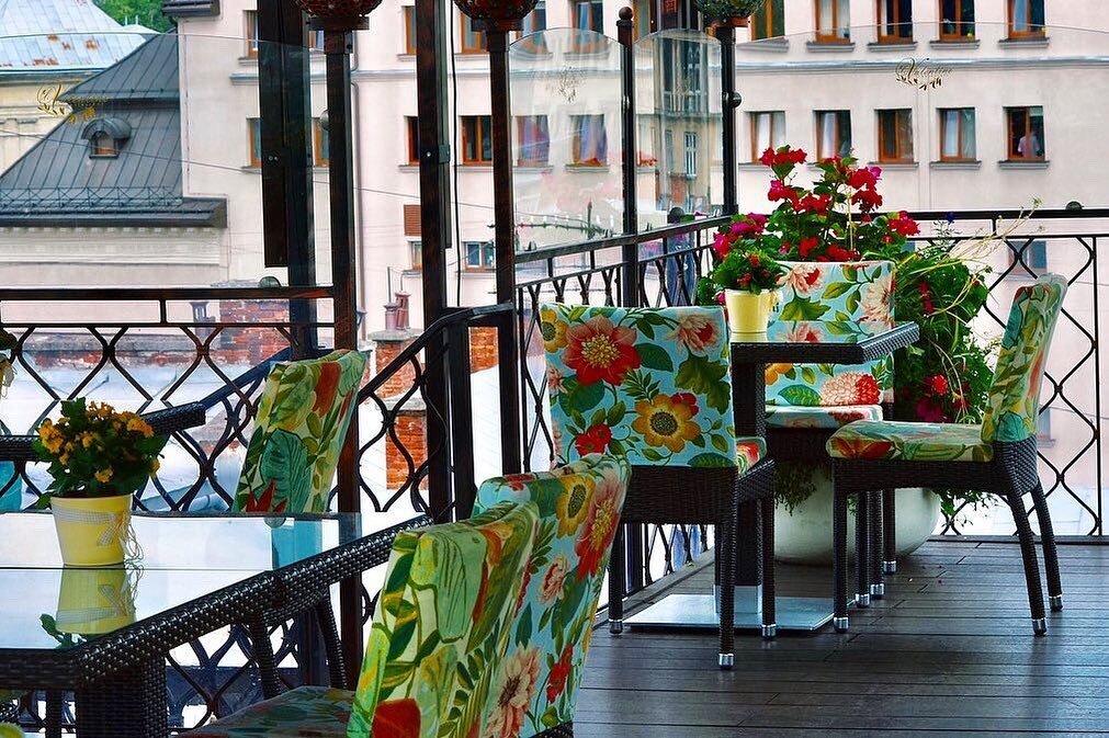 One of its highlights is the glass-roofed hall — a bright space filled with greenery and natural light. Thanks to the panoramic windows, guests can enjoy views of Lviv in any weather, especially during rainy days when the city feels particularly atmospheric. The restaurant also features private dining rooms and an intimate VIP space.