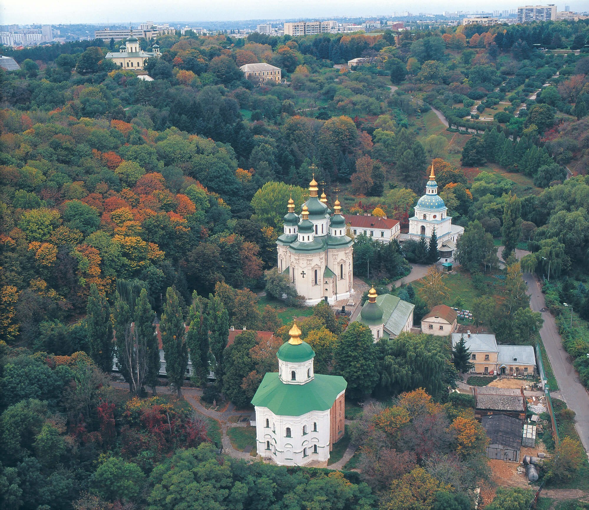 In 1070-1088 on the slopes above the Dnipro River, a six-pier five-domed St. Michael’s Church with three naves was erected. In the 15th or 16th century the temple collapsed because of flood. After the restoration in 1766-1769 the church acquired a look of a single-domed baroque structure. Partially preserved in it were graffiti, frescoes, and mosaics of the 11th century – fragments of the composition Doomsday and ornamental patterns.