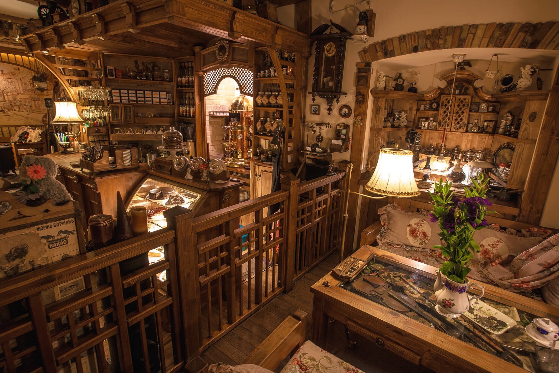 The colorful interior in the style of the petty bourgeoisie of the 19th century gives an impression that it is a French or Italian restaurant. Here there are lace curtains, porcelain dolls on the shelves, wall plates, a collection of coffee grinders. Behind one of the curtains is concealed a small boudoir. In the coffee shop is played nice music in the blues style.