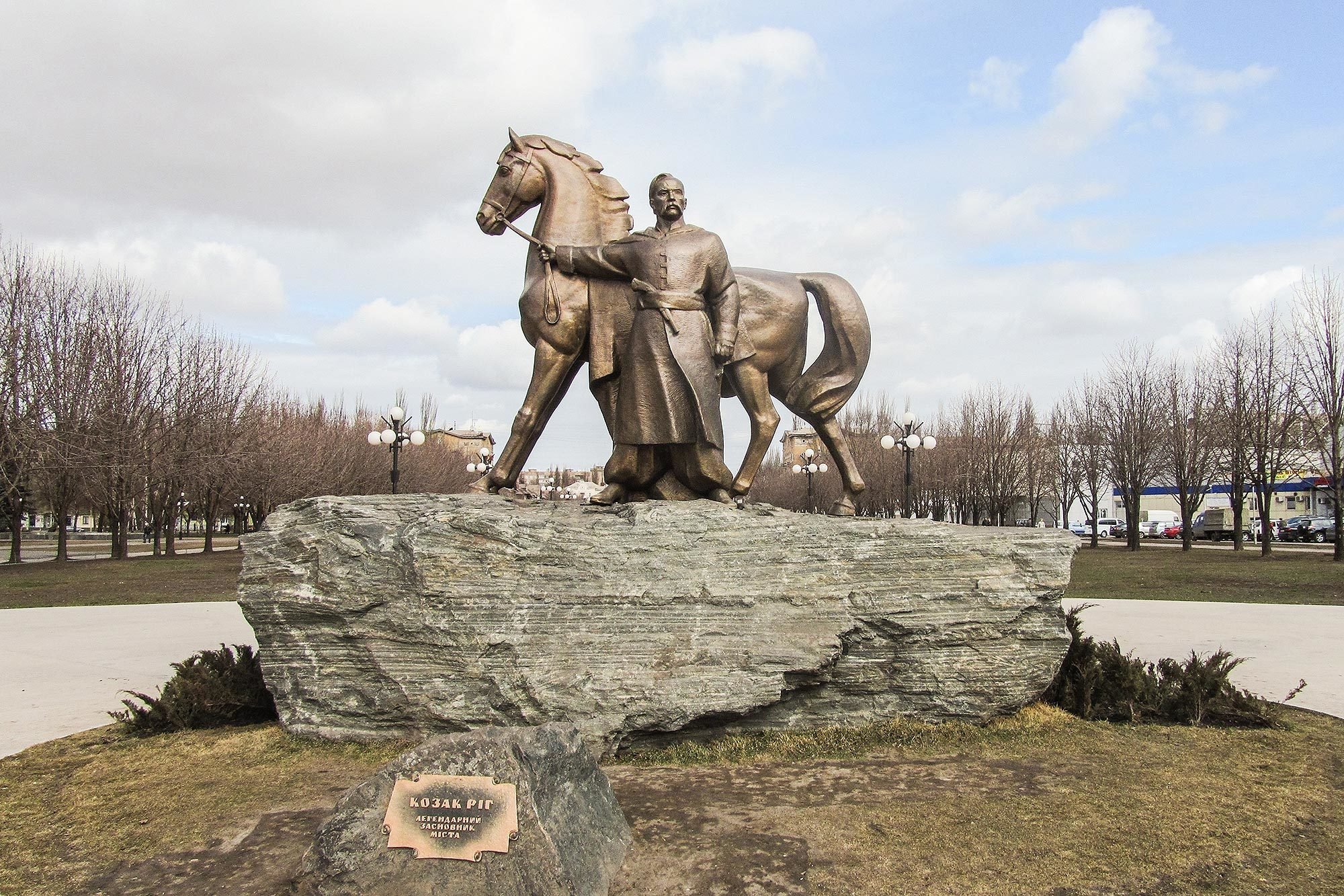Довгоочікуване відкриття скульптури відбулося в 2011 році. Фігуру козака виготовили з бронзи, її вага становить 3 тонни. Символічно, що постамент, на якому стоїть Ріг– це брила залізної руди, яку доставили з тутешнього кар'єру. Її вага – 62 тонни. Разом з постаментом висота пам'ятника досягає 5 метрів.