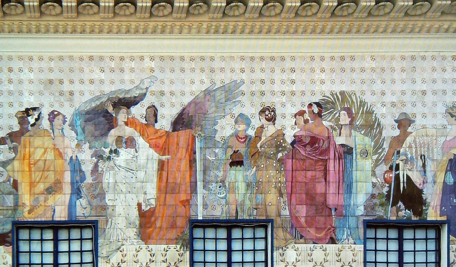По головному фасаду виділений ризаліт з балконом на консолях та розкішним майоліковим панно над балконом, автором якого є художник, чий підпис «J. Lan(g?)» зазначено у його нижній частині (Йозеф Адольф Лянг). Складна поліхромна композиція на міфологічну тематику проводить паралель між Римською імперією та Австро-Угорщиною доби Франца-Йосифа І. В образах 12 богів зображено 12 найважливіших провінцій імперії, які уособлювали її суть. На панно боги розташовані мальовничими групами згідно з основним принципом модерну: динамічна рівновага замість дзеркальної симетрії.