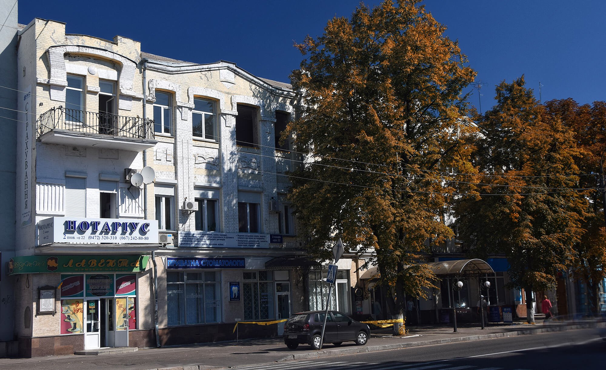 Це триповерховий цегляний будинок, на фасаді якого виділяється декоративна тега, що опускається над вікнами третього поверху і нагадує українські рушники. В роки першої світової війни на нижньому поверсі будинку працювало казино, в якому виступав видатний російській співак Федір Шаляпін.