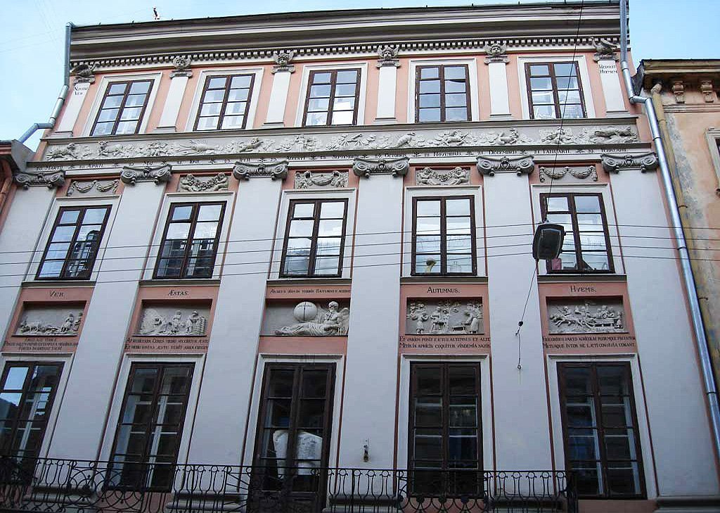 Будинок у вигляді прямокутника має п'ять вікон на кожному поверсі. Побудований він з цегли з подальшим оштукатурюванням. Його лицьова частина являє собою приклад архітектури пізнього класицизму. Це і зображення Хроноса з годинником світобудови, і сцени з життя селян "Георгіки" Вергілія, які показують різні пори року.