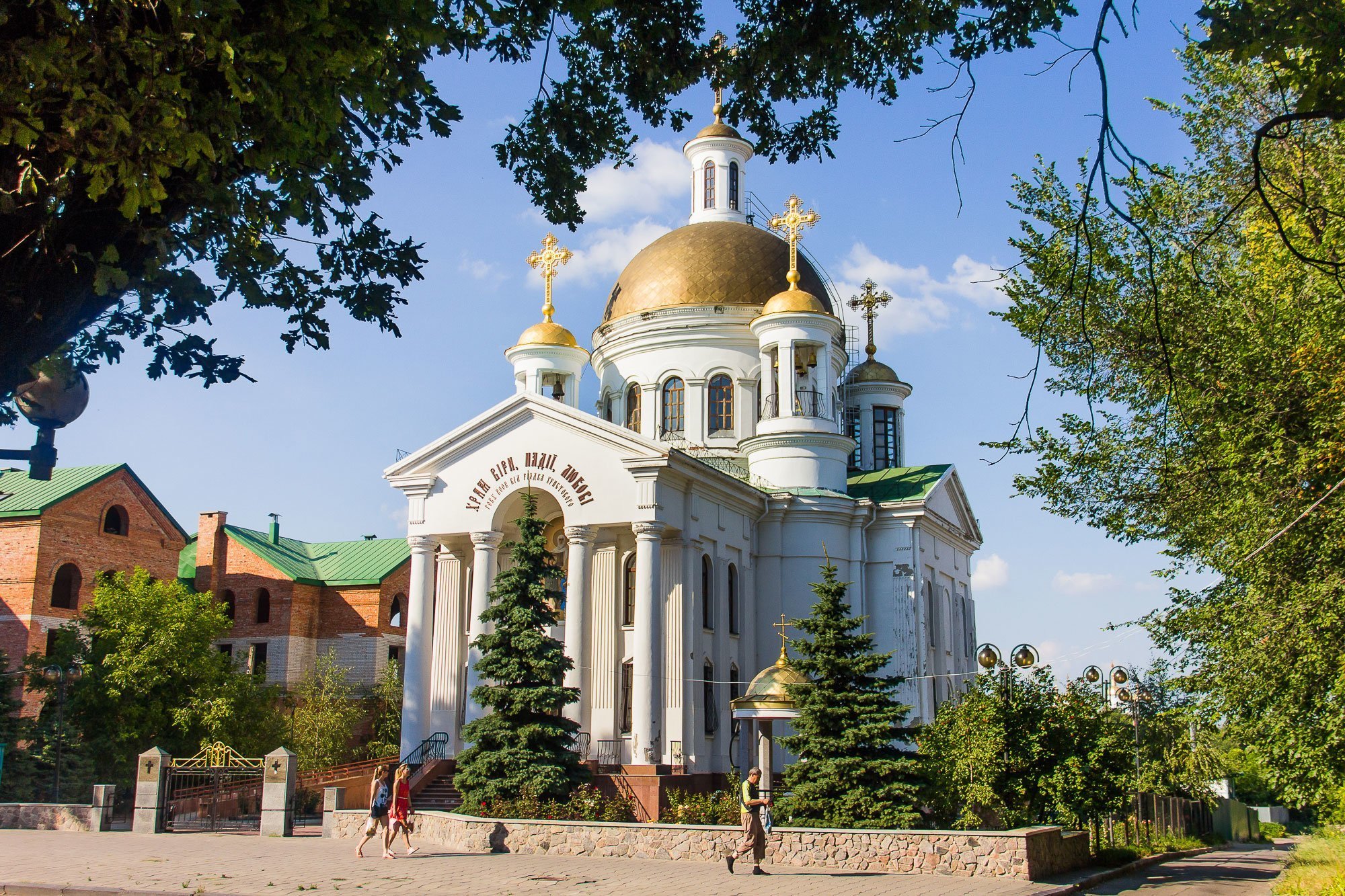 Ініціаторами будівництва виступила громада міста Полтави та жіноча релігійна громада. Святиня отримала назву Віри, Надії, Любові, їх матері Софії, ці імена носили християнські великомучениці. Автором проекту став архітектор Піцюра. В середині храм прикрашає прекрасний різьблений іконостас, виготовлений львівськими майстрами, стіни розписані художниками Петром Гуменюком, Віктором Трохимець-Мілютінном та Василем Коркишком, а деякі ікони привезені із Почаївської лаври. Гордістю собору є дзвін відлитий на місцевому тепловозоремонтному заводі, вага якого сягає 271 кілограм.
