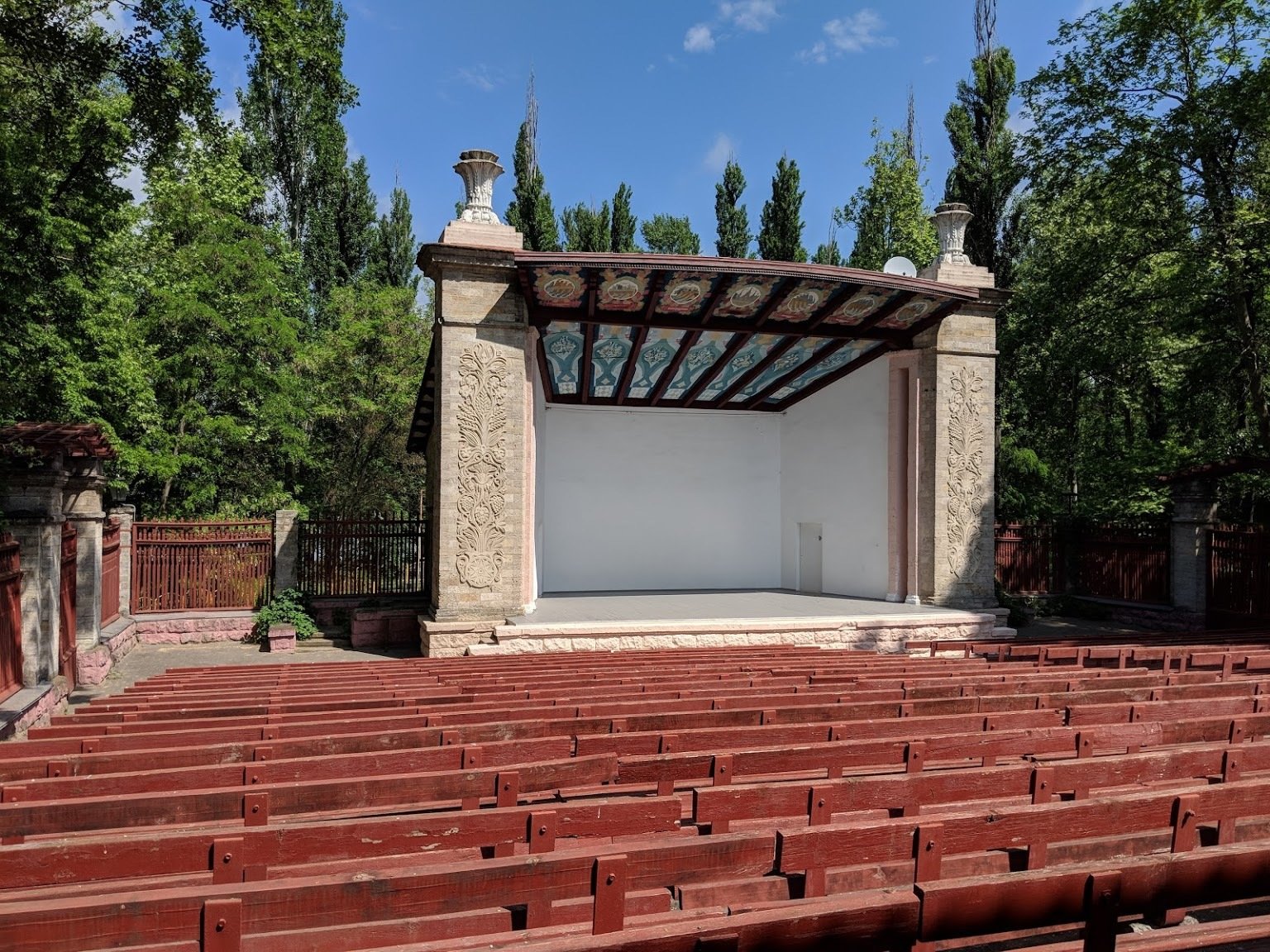 Це місце проведення багатьох культурно-масових заходів в літній період. Побудований у 1953 році за проектом архітектора Зінкевича, в псевдостародавньому стилі. Складається із вхідної частини, залу для глядачів на 850 місць та естради. Щовечора безліч жителів Нової Каховки милуються красою місцевого фонтану та кам’яними вишиванками Григорія Довженка.