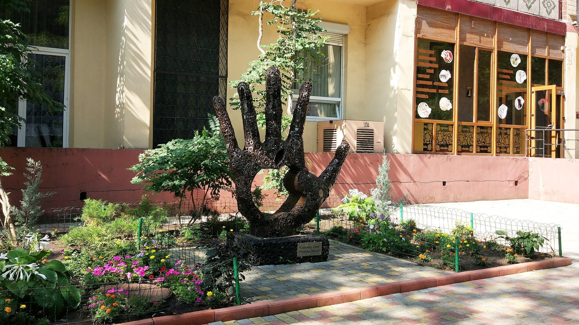 Обидва зображення утворюють у кисті наскрізний отвір. Кисть виконана на сталевому каркасі з окремих металевих деталей (авто-, мото-, велозапчастин, які до студії майстра приносили пересічні одесити), зварених між собою. У темний час доби композиція підсвічується біло-синім неоновим світлом з автономним джерелом живлення. У саму скульптуру вмонтовано пристрій, що дозволяє оточуючим мати безкоштовний доступ до Wi-Fi. З лицьового боку пам'ятника до постаменту прикріплено табличку, на якій російською та англійською мовами написано: «Спасибі, Стів».